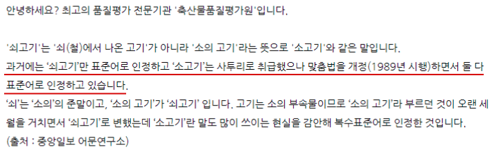 과거에는 ‘쇠고기’만 표준어로 인정하고, ‘소고기’는 사투리로 취급했으나 1989년 맞춤법 개정을 시행하면서 현재는 둘 다 표준어로 인정하고 있다고 합니다.
